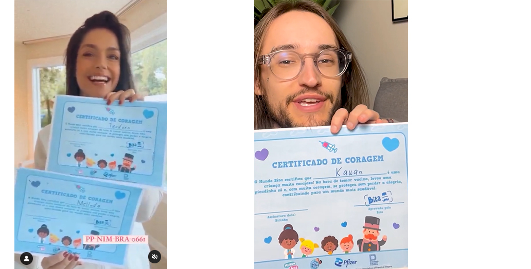 Criamos uma grande onda para divulgar a música, envolvendo os perfis da campanha Mais Que Um Palpite, Pfizer Brasil, Sociedade Brasileira de Pediatria e Mundo Bita, além publicações de vídeos reels em formato collab com 10 personalidades da internet: artistas e influenciadores digitais falando sobre a importância da vacinação, usando a música da campanha e incentivando o download do Certificado de Coragem.